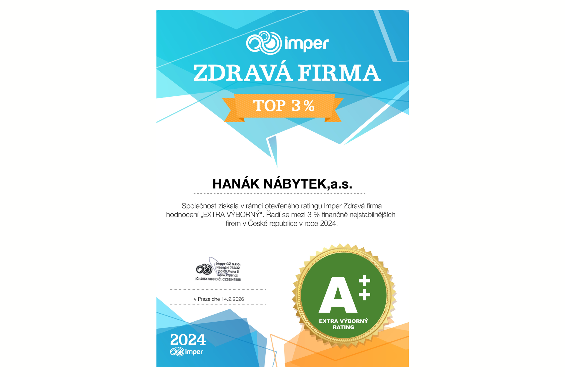 Společnost HANÁK NÁBYTEK, a.s. získala v rámci otevřeného ratingu Imper Zdravá firma nejvyšší možné hodnocení EXTRA VÝBORNÝ (A++) a oficiálně se tak řadí mezi 3 % finančně nejstabilnějších firem v České republice.