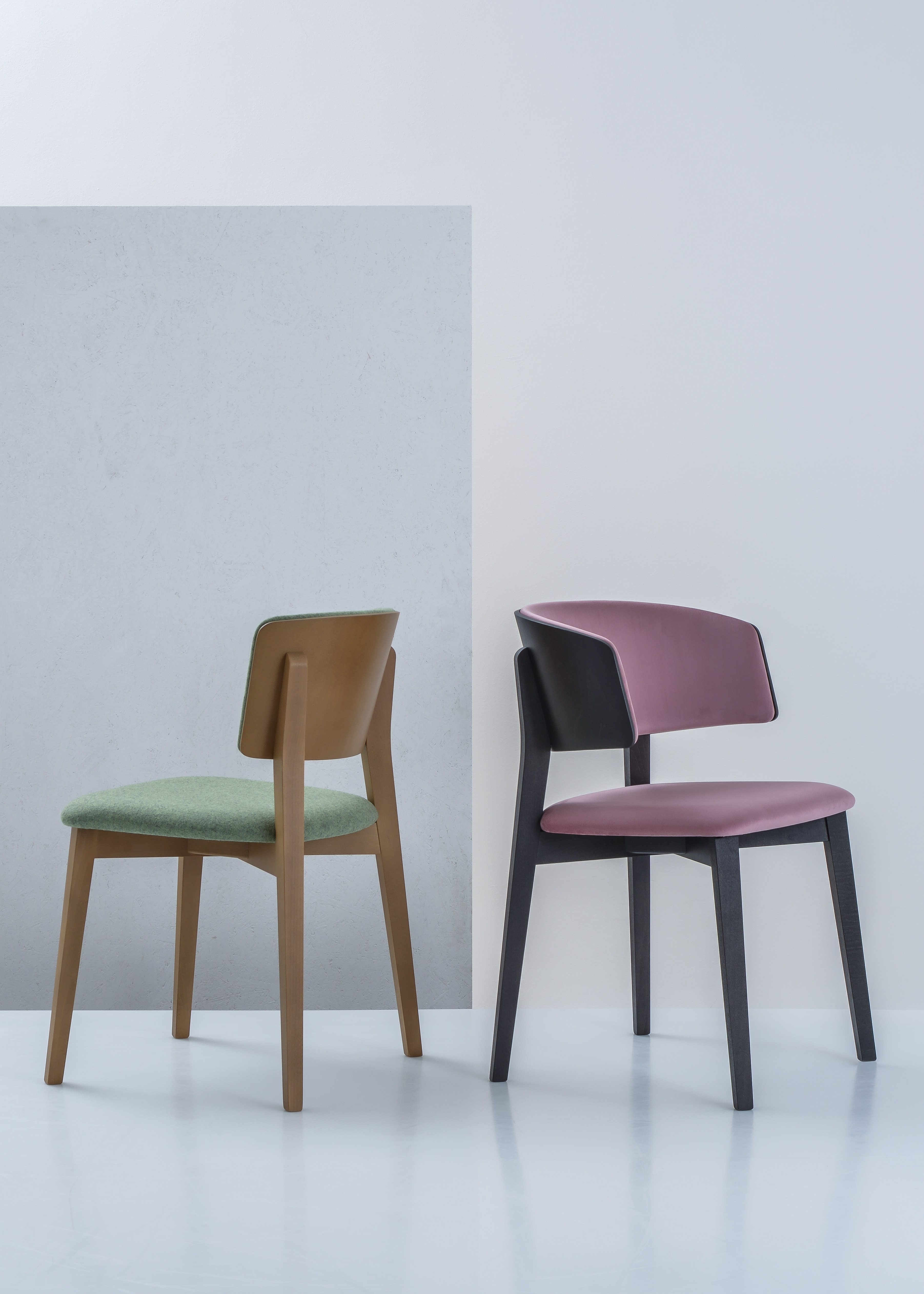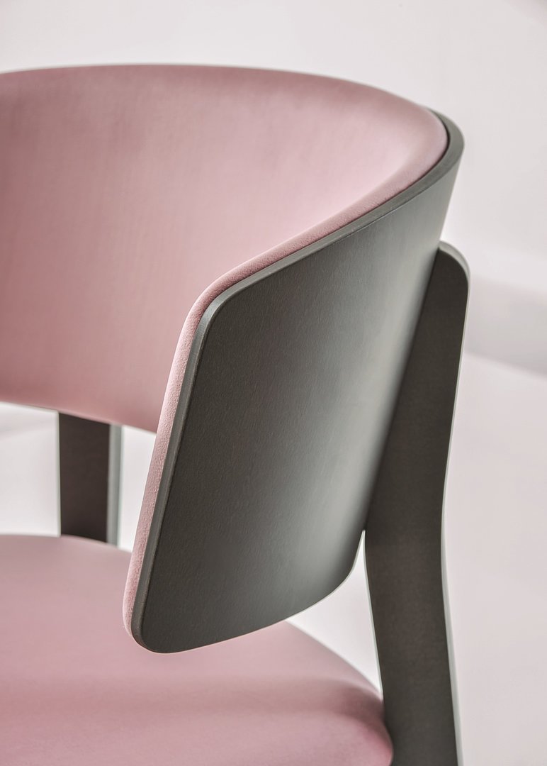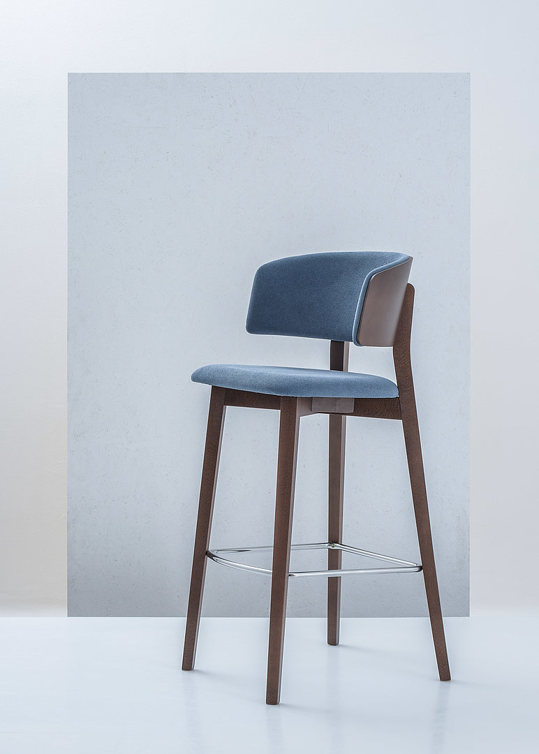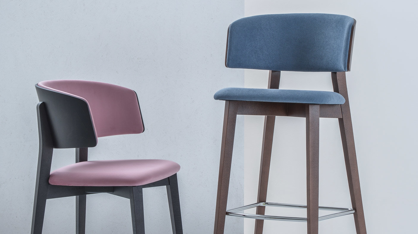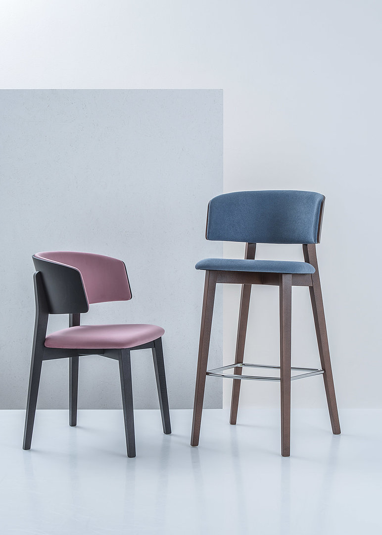 Kolekce SMILE WOOD nabízí křeslo, barovou a kuchyňskou židli. Všechny varianty jsou dostupné v mnoha barevných kombinacích čalounění a dřevěného moření.
