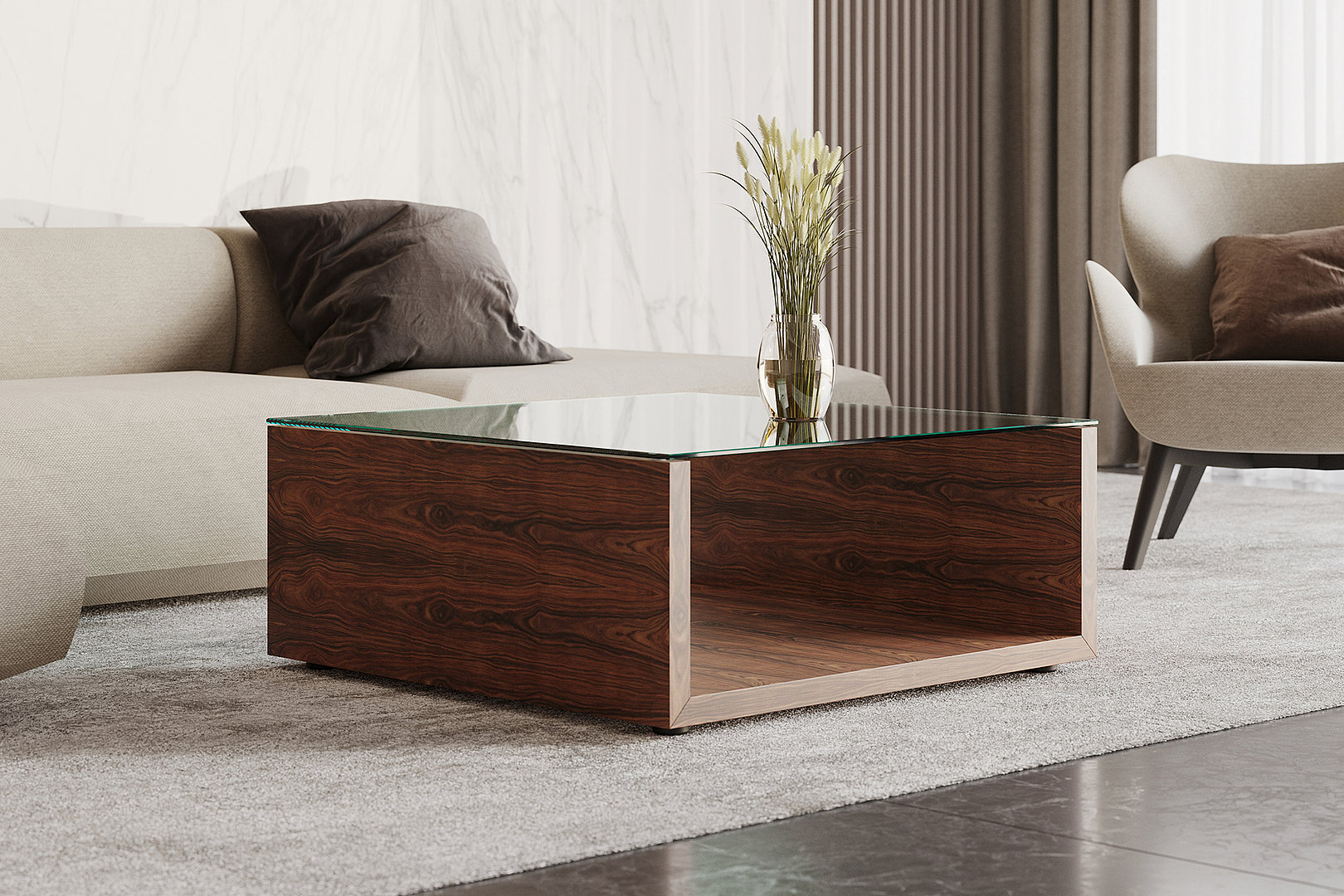 Luxusní konferenční stolek v dýhovaném a lakovaném provedení či dřevodekoru s horní skleněnou plochou v čirém, kouřovém, temně šedém a mléčném provedení.