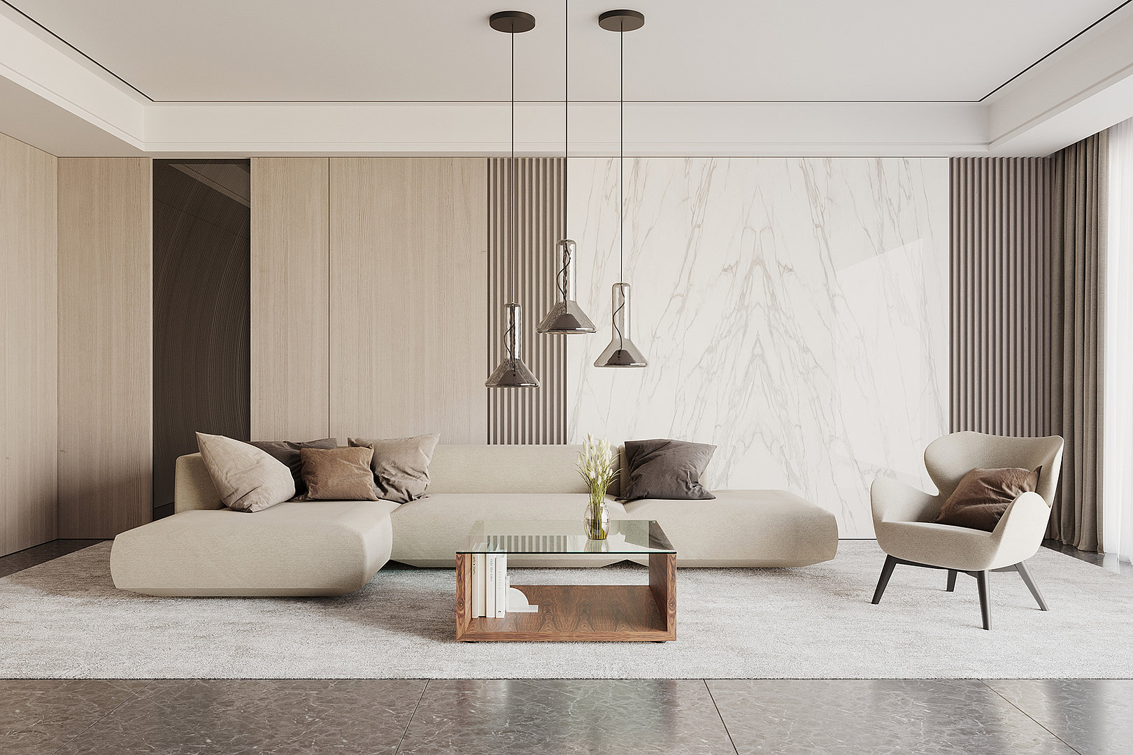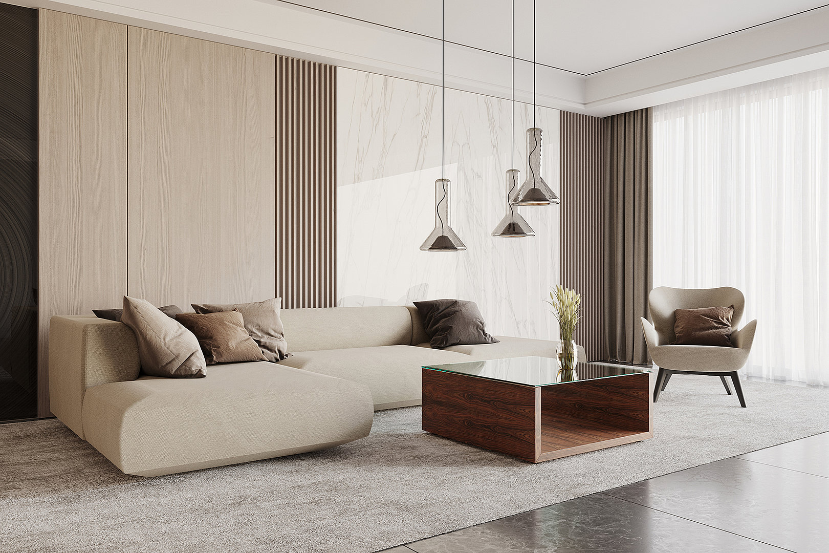 s otevřeným prostorem dává vyniknout všem použitým materiálům.