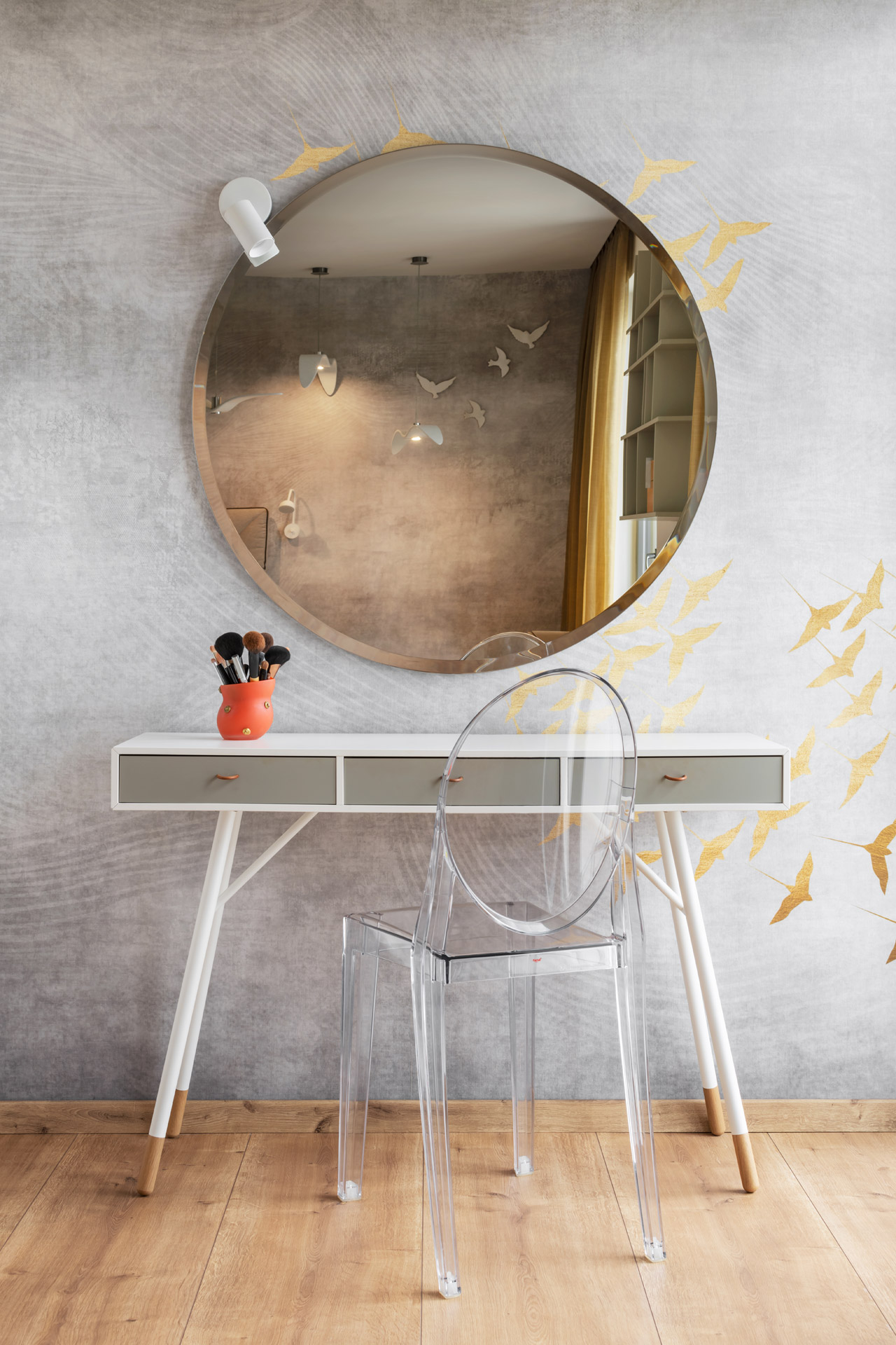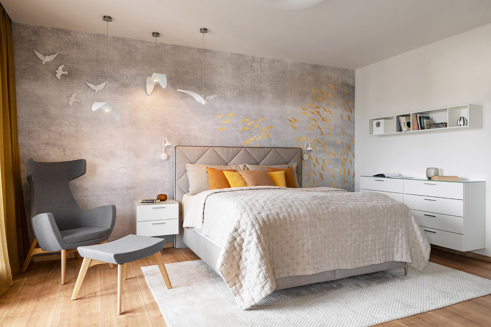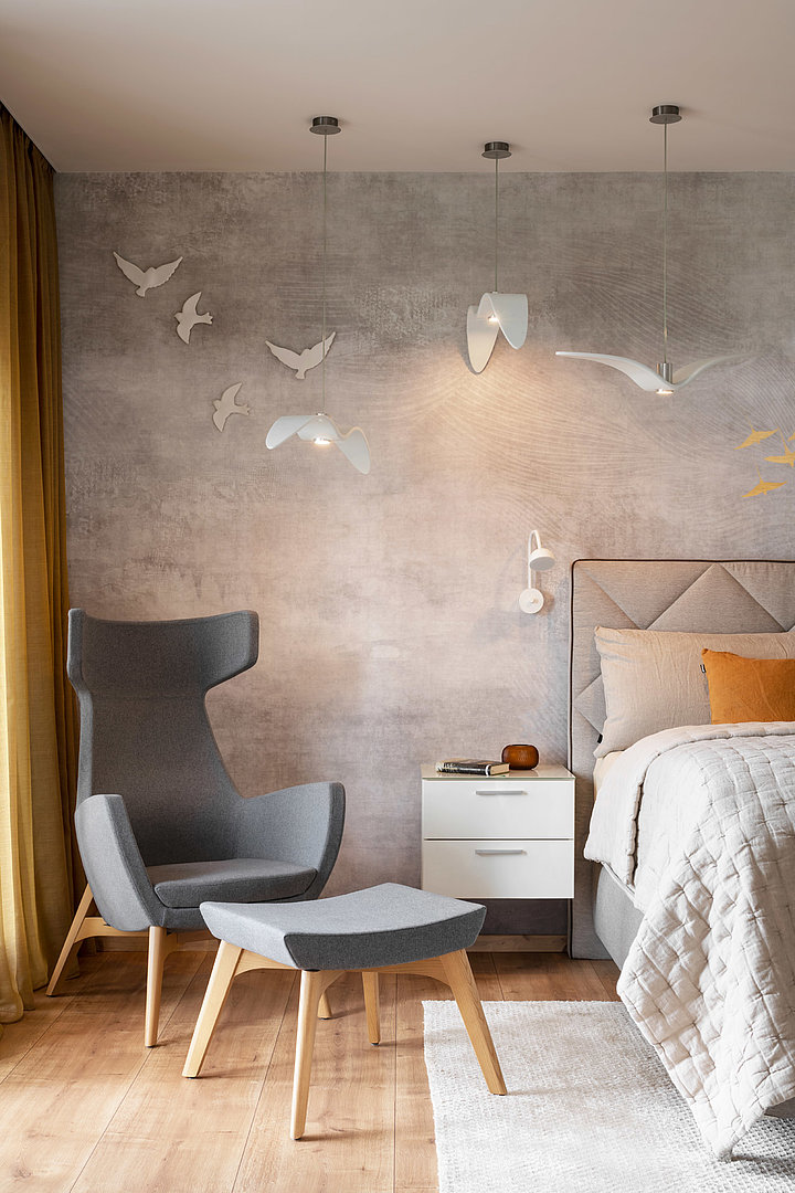 Tapeta s motivem letících ptáků v jemných přírodních odstínech vytváří velmi příjemnou až uklidňující atmosféru. Tapety na míru umožňuje vtisknout jakémukoli interiéru požadovanou identitu.