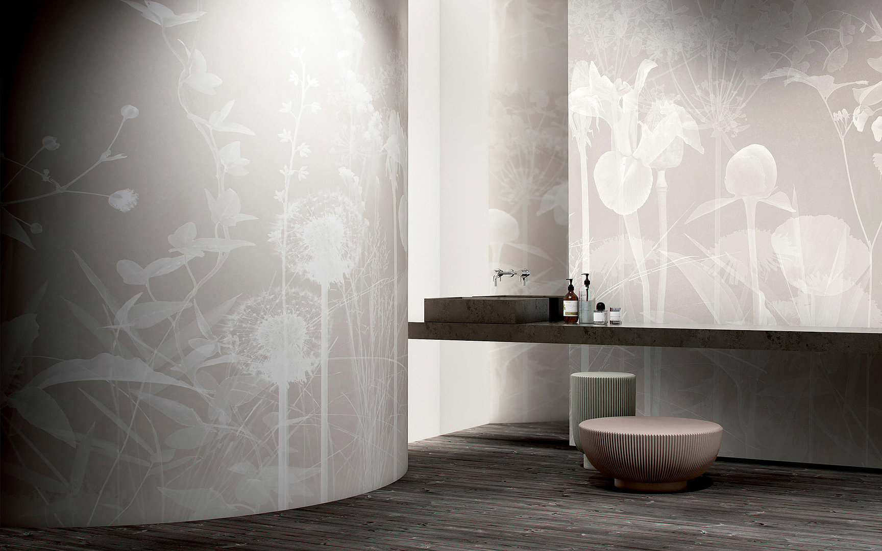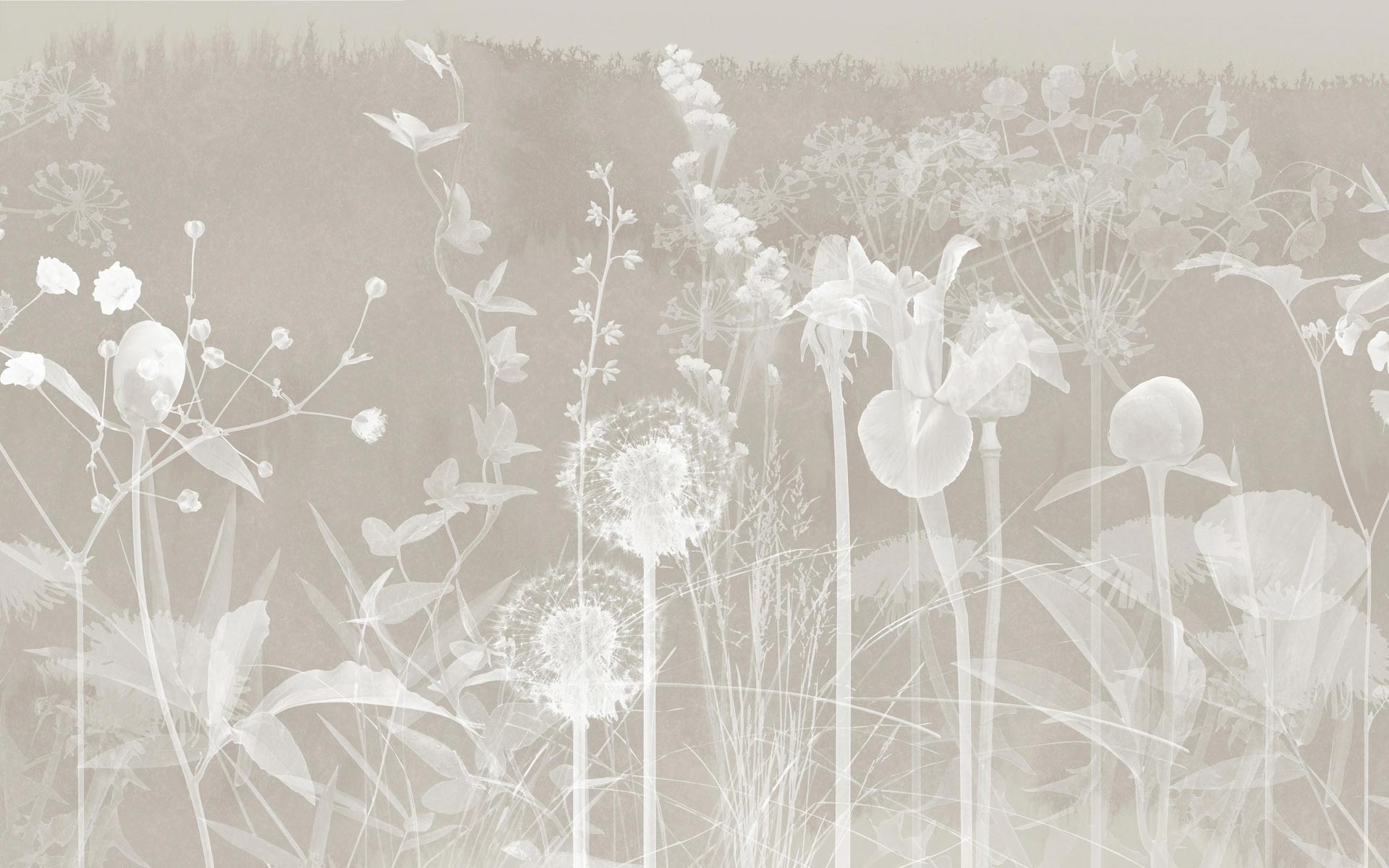 Tapeta s jemným rostlinným motivem rozkvetlé zahrady plné kosatců, pampelišek a travin.