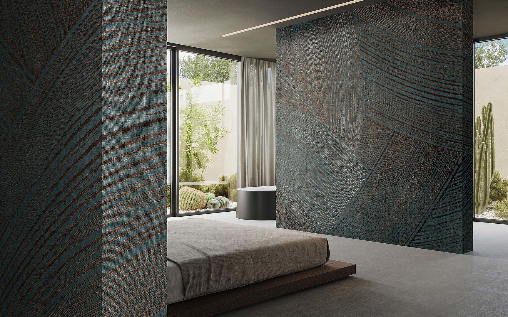 Kotouče, zbrázděné důmyslnou povrchovou úpravou, se navzájem překrývají a působí dynamicky. Vzácná textura s odstíny v harmonickém kontrastu.